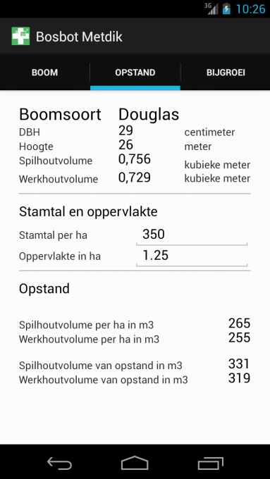 Door de oppervlakte in hectares in te vullen kan Bosbot metdik ook de gegevens voor de hele opstand berekenen.